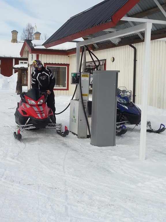 Vi har naturen runt knuten och njuter av att kunna ta oss iväg på skotern i solskenet! Så här ser det ut innan vi far ut på skotrarna. Vi inleder med att tanka och det gör vi utanför huset där vi har vår lagerlokal. Praktiskt!
